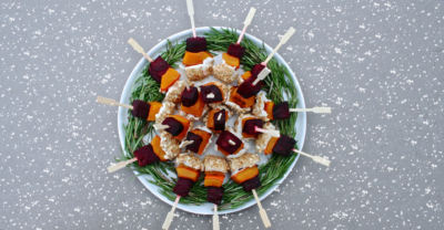 8Je einen Kürbis- und einen Rübenwürfel aufspießen, in den Cashew-Dip tunken, in gehackten Nüssen wenden und auf einen schönen Teller oder einen Servierplatte drapieren. Für die festliche Deko nehme ich ein paar Rosmarinzweige her, die wie Tannenreisig wirken.