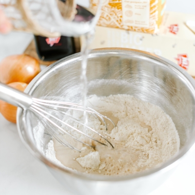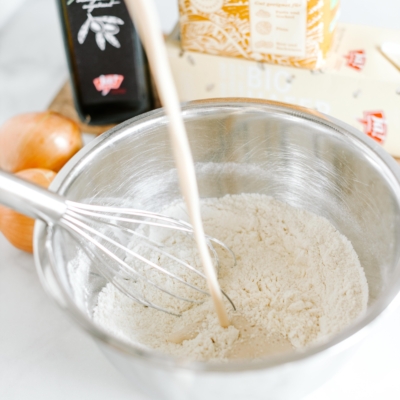 2Zwiebel schälen, in dünne Ringe schneiden und mit Pizza- und Pastamehl und Salz vermengen.