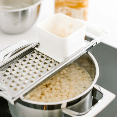 4Salzwasser in einem Topf erhitzen und den Spätzleteig portionsweise oder mit einer Spätzlereibe ins Wasser reiben.