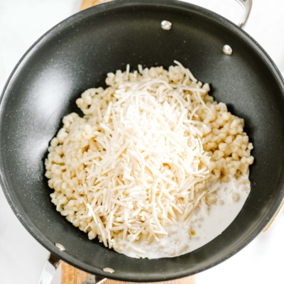 6Die Spätzle mit 200 ml Hafedrink und veganem Käse in den Topf geben und auf mittlerer Stufe unter ständigem Rühren die Käsespätzle kochen, bis der Käse vollständig aufgelöst ist.