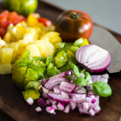 3In der Zwischenzeit die Paradeiser-Raritäten waschen und würfeln, das Basilikum abzupfen und die Zwiebel und die Kapern grob hacken.
