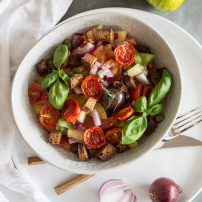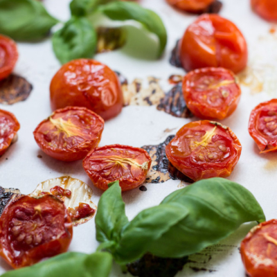 4Sind die Paradeiser schon etwas dunkel, der Knoblauch weich und das Brot durchgeröstet, das Backblech aus dem Ofen entfernen.