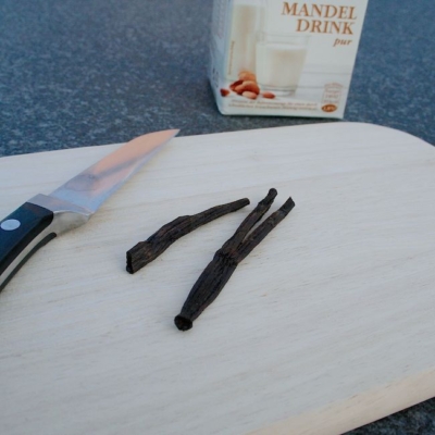 3Die Vanilleschote längs aufschlitzen, das Mark auskratzen.