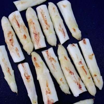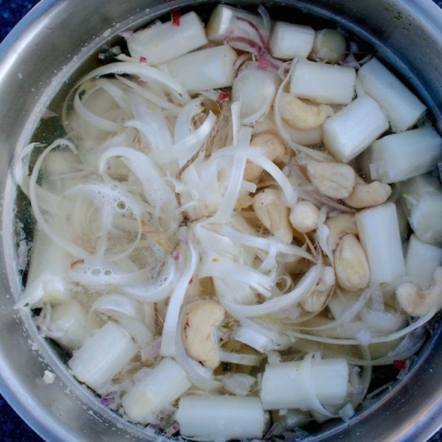 4Die Schalotten in einem Topf bei mittlerer Hitze mit 1 EL Öl vorsichtig glasig anschwitzen, Spargelstücke ohne Spitzen zugeben und mit Wasser aufgießen. Die Schalen, Cashewkerne, Vanillemark und den Schotenrest in den Sud geben, salzen.