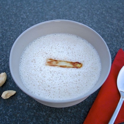 6Wenn der Spargel in der Suppe weich gekocht ist, Schalen fest ausdrücken und mit dem Vanilleschotenrest entfernen, die Suppe mit dem Mandeldrink aufgießen. Zitronensaft und eine Prise Zucker dazugeben.
