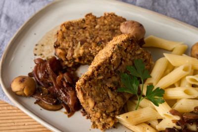 Veganer Maroni-Weihnachtsbraten mit Penne und Rotkraut