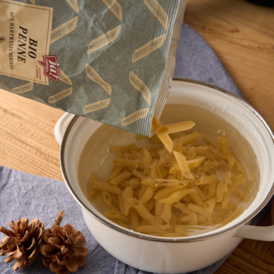 5Währenddessen das Bio-Rotkraut und das Bio-Kürbisgemüse laut Packung zubereiten. Ebenso die Bio-Penne kochen.