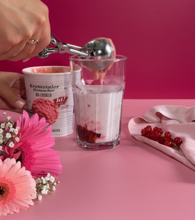 3Nun ein bis zwei Kugeln vom Bio-Erdbeereis in den Drink geben. Mit einem kleinen Schuss Bio-Rote Rübensaft schenkst du deinem Pink Drink die wunderbare knallig pinke Farbe - ganz ohne künstliche Zusätze!
