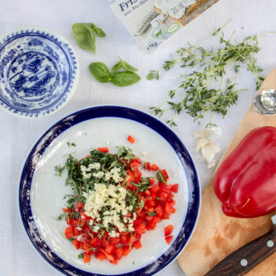1Den Paprika fein würfeln, Knoblauch und die Kräuter hacken.