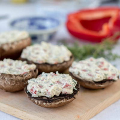 4Die Frischkäsemasse in die Champignonköpfe füllen und glatt streichen.