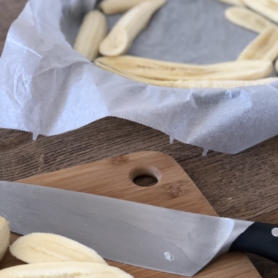 4Bananen der Länge nach in Scheiben schneiden und mit der Schnittfläche nach unten in die Quicheform schlichten