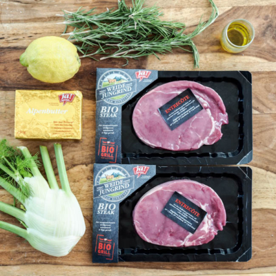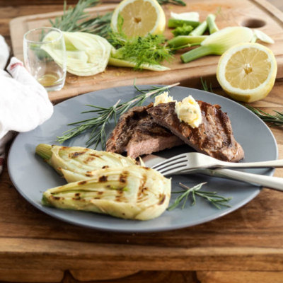 6Derweil die Steaks mit etwas Öl bepinseln und ebenfalls auf den Grillrost legen, kurz heiß angrillen und wenden, dann salzen und pfeffern und mit dem Fenchel und der Zitronen-Rosmarin-Butter servieren.