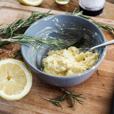 3Die Butter leicht temperieren lassen, dann mit dem Handrührgerät cremig rühren, Zitronenschale und –saft sowie den Rosmarin untermischen und mit Salz abschmecken. Bis zur Verwendung kühl stellen.
