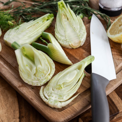 4Den Fenchel waschen, das Fenchelgrün abschneiden (am besten zur weiteren Verwendung aufheben!) und den holzigsten Teil des Strunks entfernen, diesen jedoch nicht ganz abschneiden. Nun den Fenchel in ca. 2 cm dicke Scheiben schneiden und mit etwas Öl bepinseln.