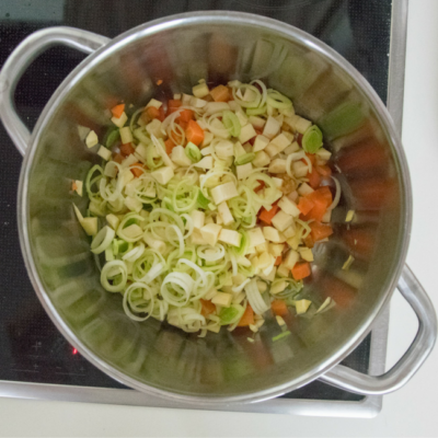6Olivenöl in einem Topf erhitzen. Knoblauch, Erdäpfel, Pastinaken, Topinambur, Karotten und Lauch darin anschwitzen. Anschließend alle Gewürze hinzugeben und alles mit der Gemüsebrühe aufgießen.