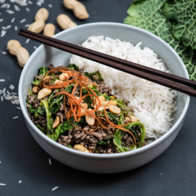 5Die Erdnüsse beigeben, mit Sojasauce abschmecken und mit Reis servieren.