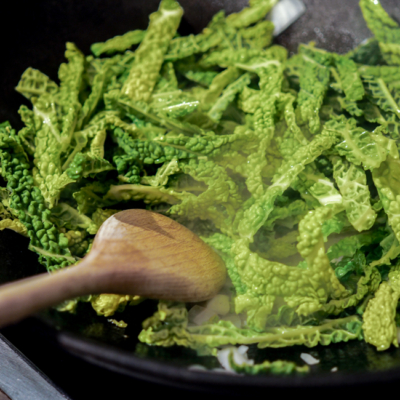 31 EL Sonnenblumenöl im Wok erhitzen und die Zwiebel glasig anschwitzen. Erst den Grünkohl, etwas später die Karotten beifügen und ein paar Minuten durchrösten, bis der Kohl beginnt weich zu werden. Dann das Gemüse aus dem Wok entfernen und beiseitestellen.