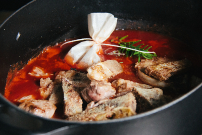6Nun die Knochen und das Fleisch sowie die Kräuter herausnehmen. Die ausgekochten Knochen werden nun nicht mehr benötigt. Das Fleisch mit zwei Gabeln auseinanderziehen.