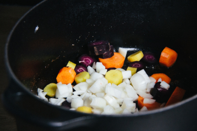 2Das Butterschmalz in einem großen Schmortopf zerlassen und die mehlierten Rindsknochen darin goldbraun anrösten. Herausnehmen und beiseite stellen. Dann die mehlierten Edelgulaschstücke goldbraun anbraten, ebenso herausnehmen und zu den Rindsknochen geben.