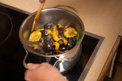 3Die Zwetschken dazugeben und ca. 6 min köcheln lassen. So lange köcheln, bis sich eine „dünne Haut“ über die Masse bildet.