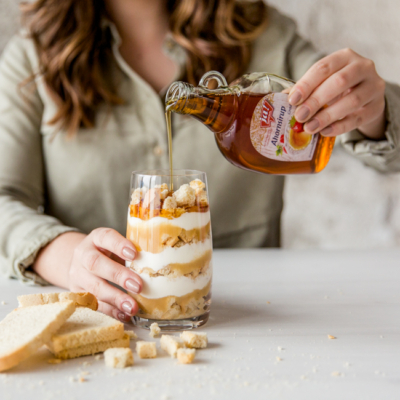 32-3 Esslöffel Apfelmus sowie 2-3 Esslöffel Joghurt griechischer Art darübergeben, dann wieder je eine Schicht Zwiebackstücke, Apfelmus und Joghurt und eventuell noch ein drittes Mal den Schichtvorgang wiederholen.
